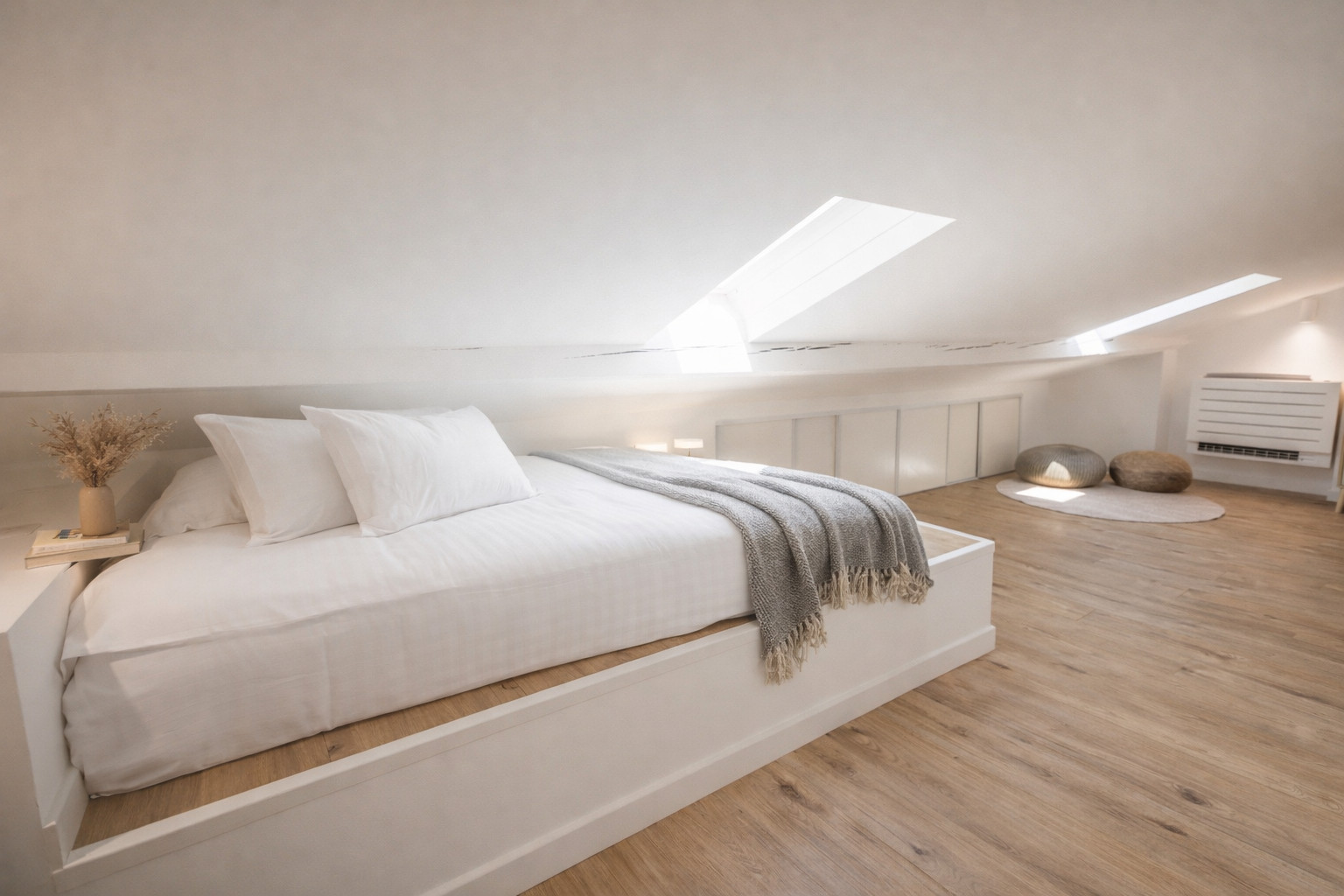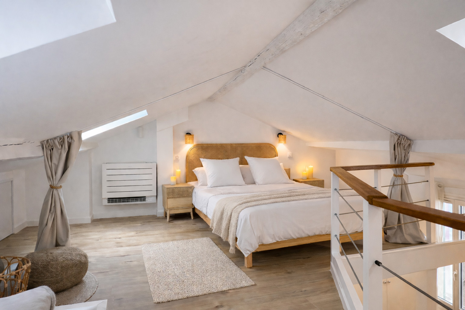 The home comfortably accommodates up to 5 guests with two double beds and a pull-out sofa. The spacious mezzanine is easy to access, and natural light fills the space thanks to two large windows and three skylights.
