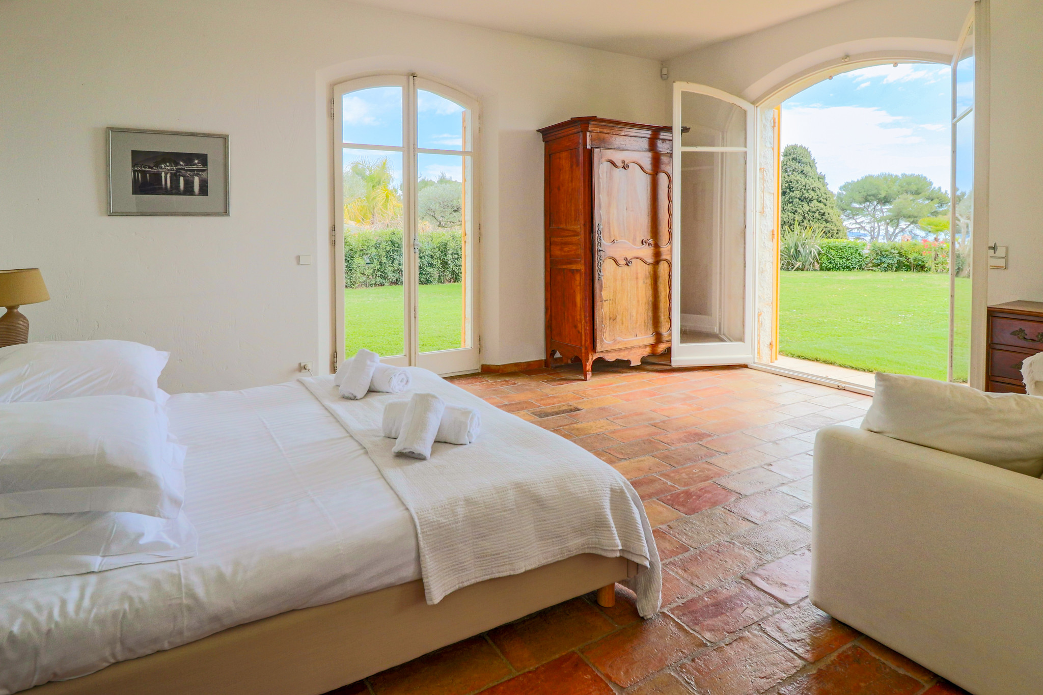 As soon as you enter, you will find a vast cathedral lounge of 70 m² with a period stone floor, a stone fireplace and large openings that let in natural light. The 4 en-suite bedrooms, all air-conditioned, offer absolute comfort. You will also find a sleeping area (ideal for children) and a studio adjoining the villa with a bedroom, a bathroom and a toilet.
