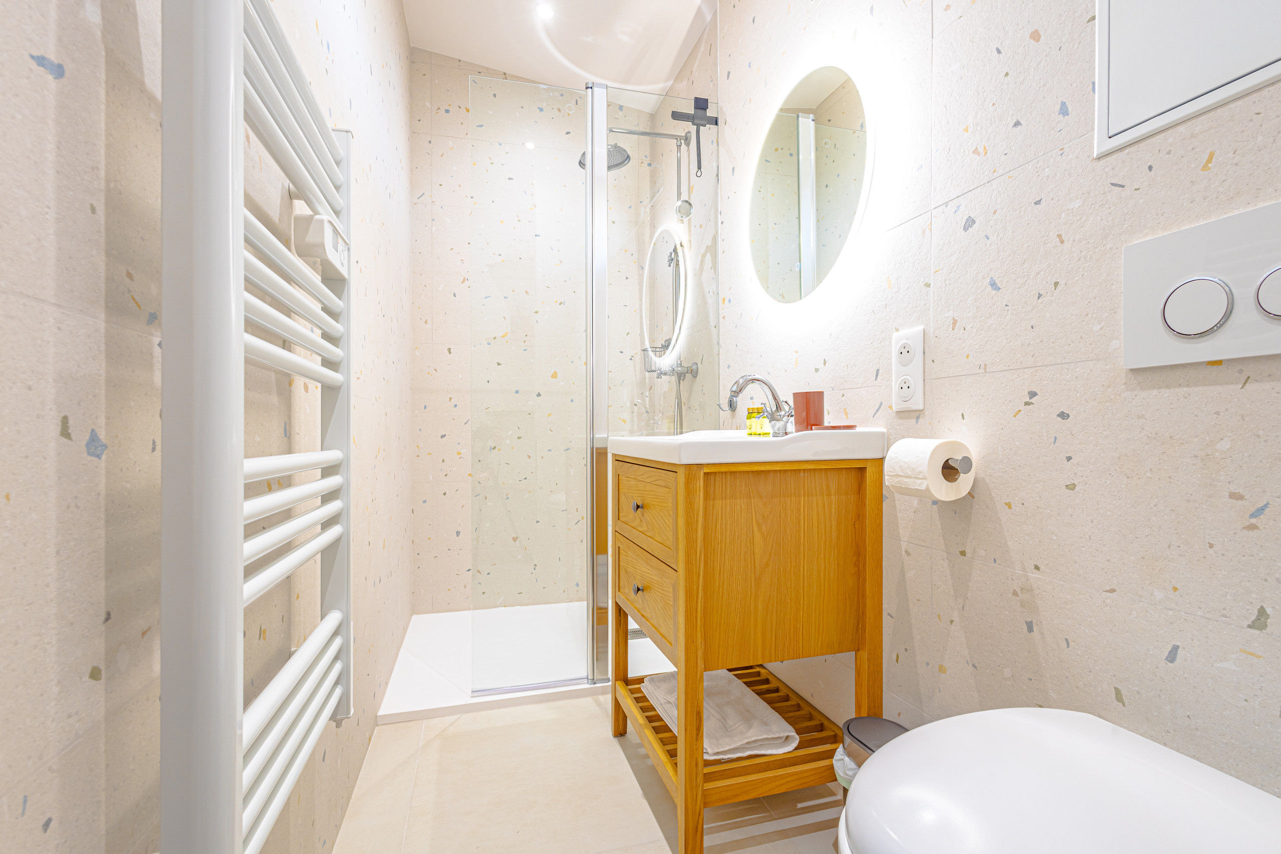 Équipements modernes : TV connectée, internet fibre, double climatisation, rangements pratiques et confortables.